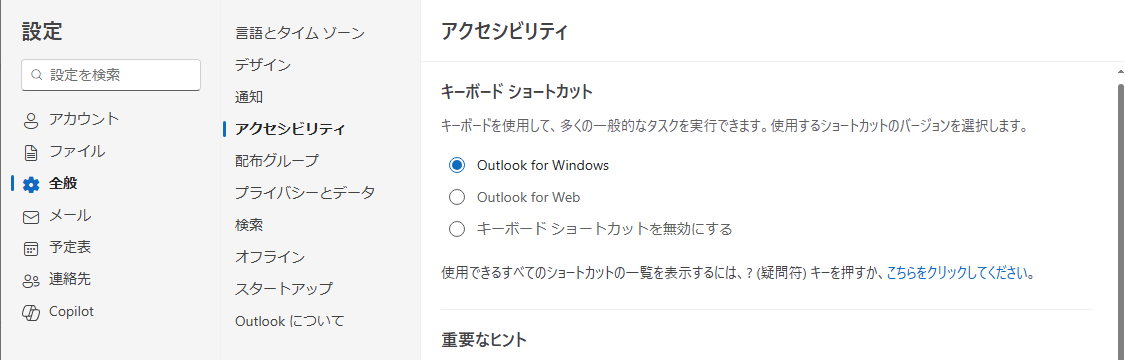 新しい Outlook では [設定] - [全般] - [アクセシビリティ] の [キーボード ショートカット] より、以下の項目を選択できます。
