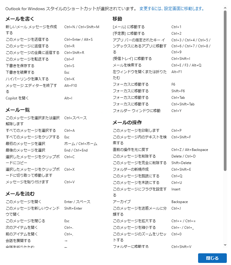 新しい Outlook のショートカット キーより、Outlook for Windows と Outlook for Web の設定にてそれぞれ利用可能な便利なショートカット キーの一部をご紹介します。