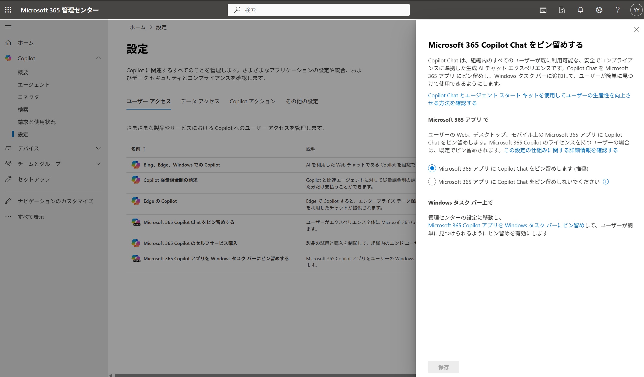 Microsoft 365 管理センター内の [Copilot] - [設定] - [ユーザー アクセス] - [Microsoft 365 Copilot Chat をピン留めする] にて、以下いずれかを設定します。