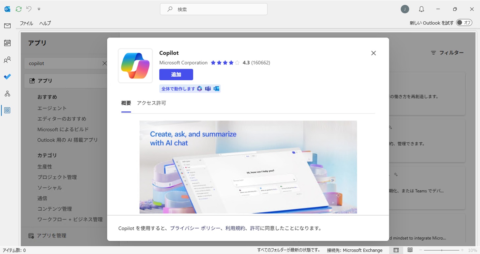 [Microsoft 365 アプリに Copilot Chat をピン留めしないでください] に設定を変更後、Copilot ライセンスを未割り当てのユーザーのすべての Outlook から Copilot Chat のピン留めが解除されたとしても、従来の Outlook for Windows などの [アプリの追加] 画面からユーザー操作により “Copilot” を検索して追加することで、 Copilot Chat をインストールすることが可能です。