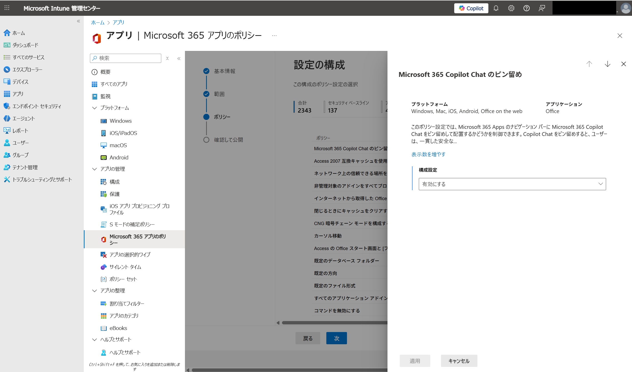 これに加えて、新規に作成したクラウド ポリシーから [Microsoft 365 Copilot Chat のピン留め] を設定したポリシーを作成する方法でも、上記と同様のピン留めの制御を実現できます。