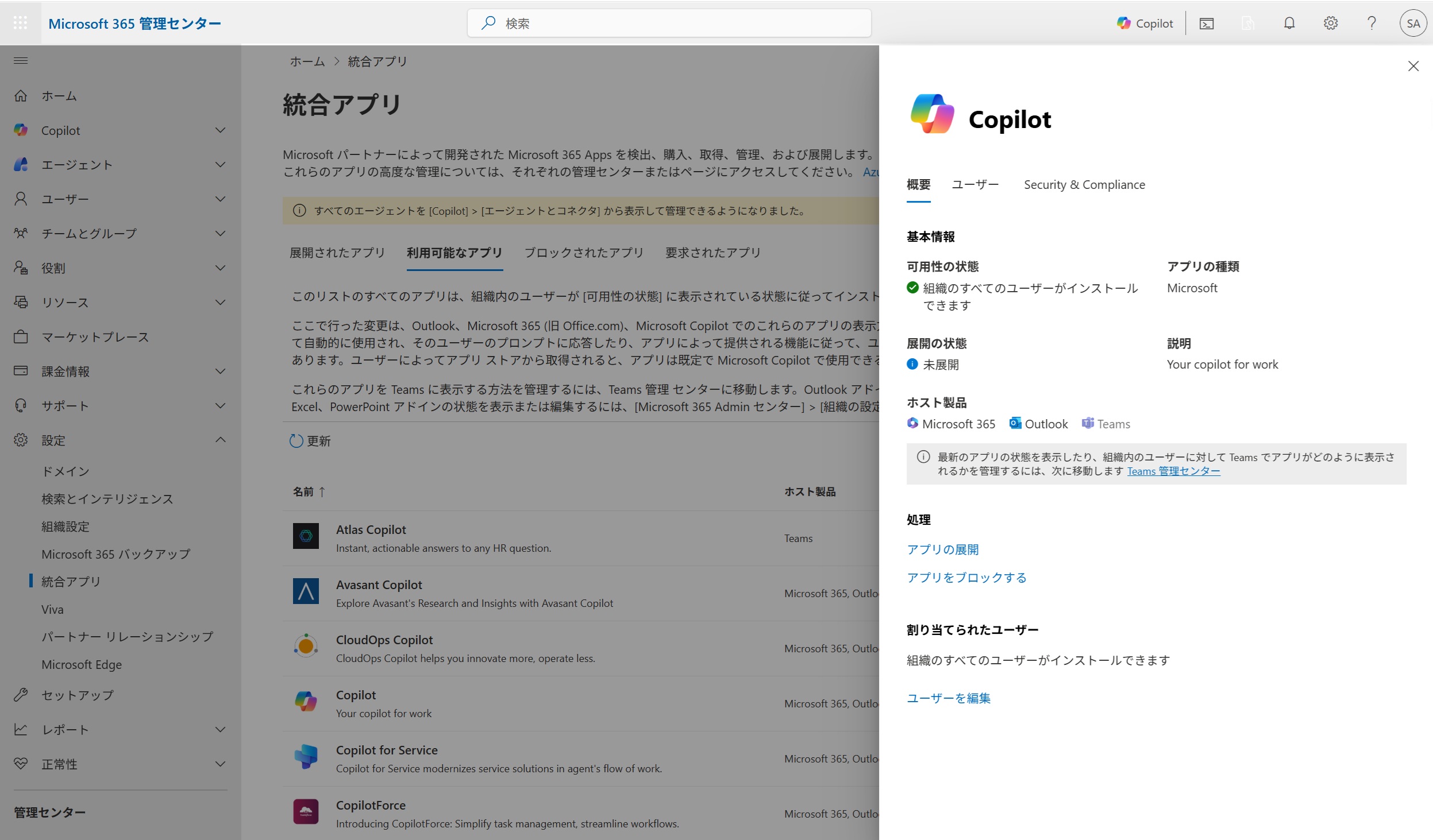 Microsoft 365 管理センターの [設定] - [統合アプリ] - [利用可能なアプリ] にて、Copilot アプリの展開、またはブロックのいずれかを設定します。