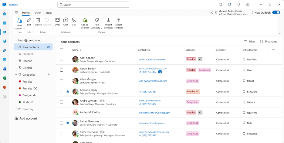 これらの大きな進化に加えて、新しい Outlook for Windows の新しい連絡先には、日々の連絡先管理を刷新する機能が用意されています。